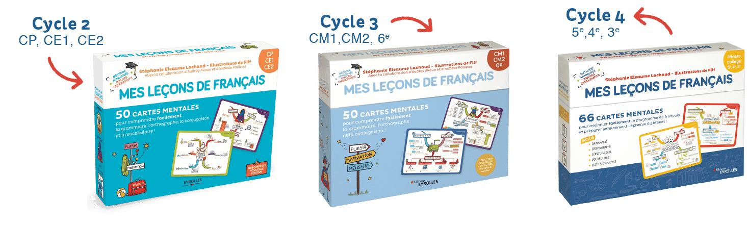 Retrouvez l’essentiel du programme scolaire de français du CP à la 3ᵉ transformé en cartes mentales. Conformes au programme de l’Éducation nationale, nos coffrets sont conçus par cycle pour vous permettre de les garder longtemps, en couvrant trois années scolaires. Pratique pour revoir les bases !
