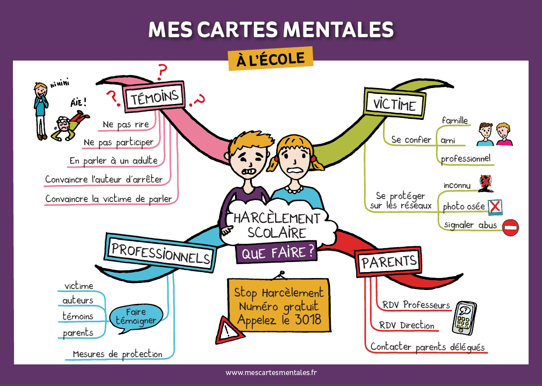 Victime, parents, professionnels, témoins : nous avons récapitulé, dans une carte mentale, les réflexes à avoir pour lutter contre le harcèlement scolaire.