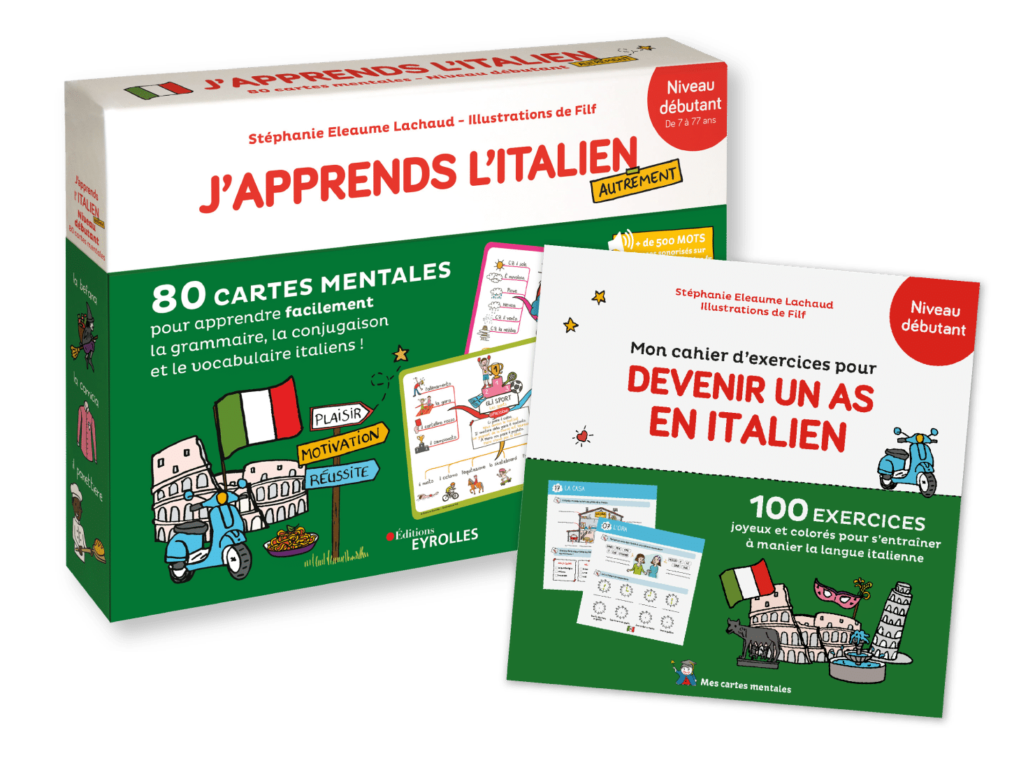 Ce pack comprend un coffret de cartes mentales « J’apprends l’italien autrement » (niveau débutant) + un cahier d’exercices pour s’entraîner et devenir un as en italien.
